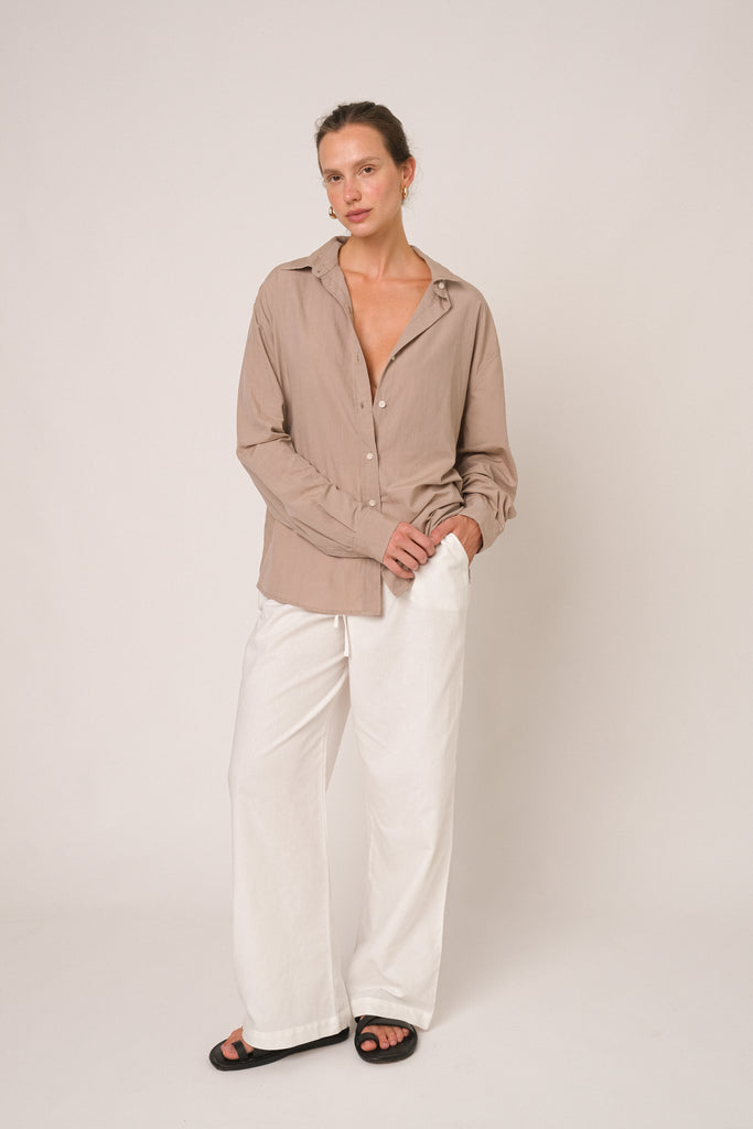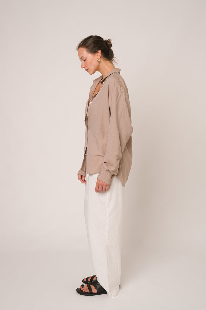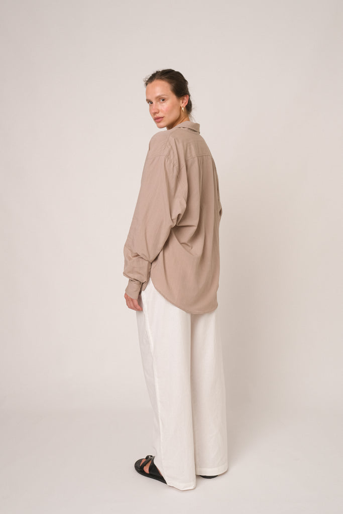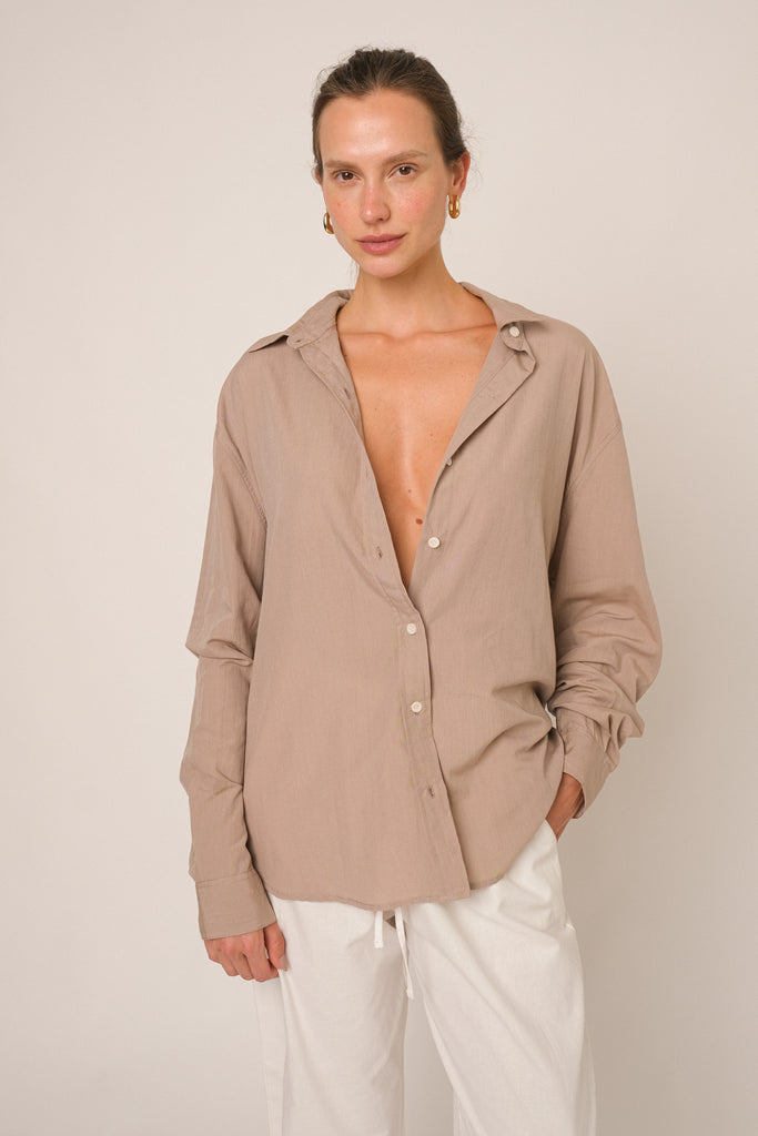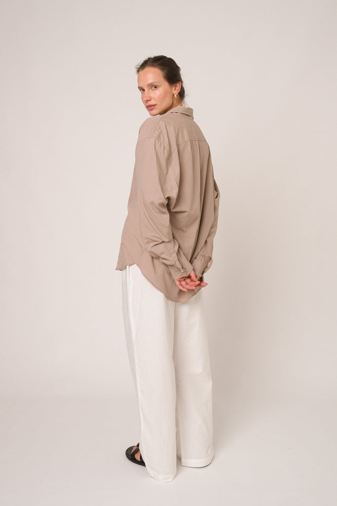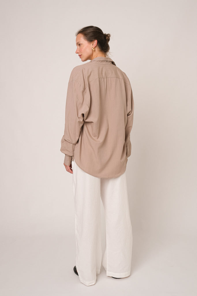 Camisa com modelagem levemente oversized, tingida naturalmente com Acácia Negra e produzida com fibras nobres e certificadas. Possui botões naturais de semente de corozo.