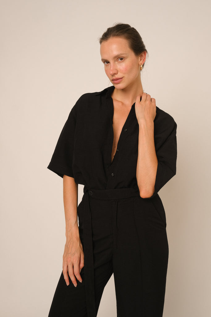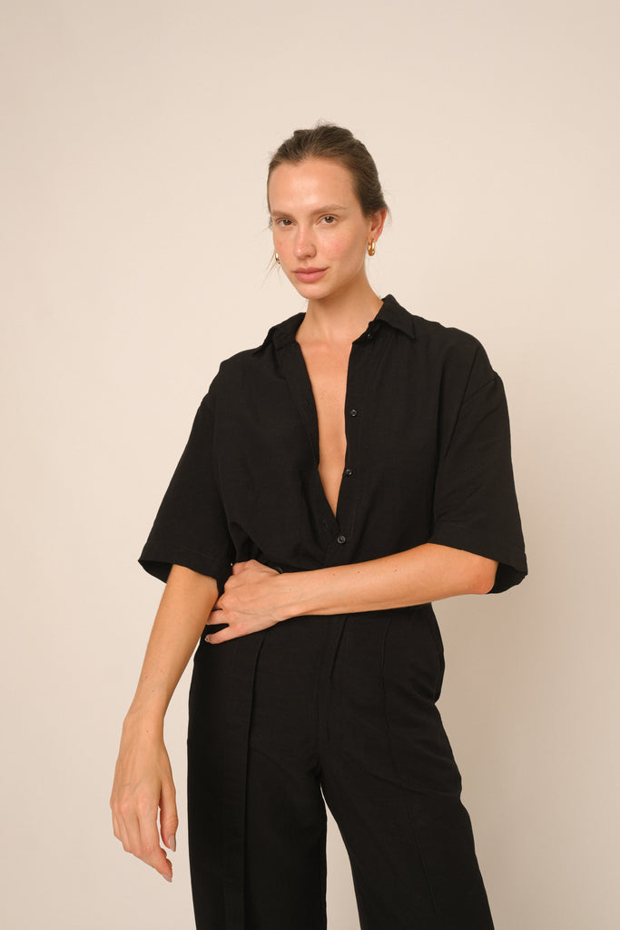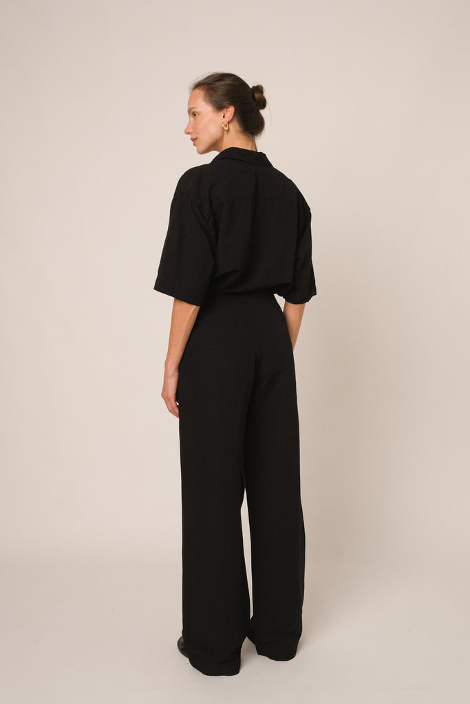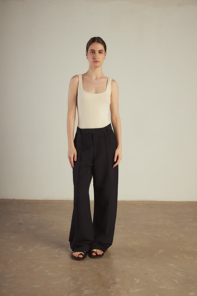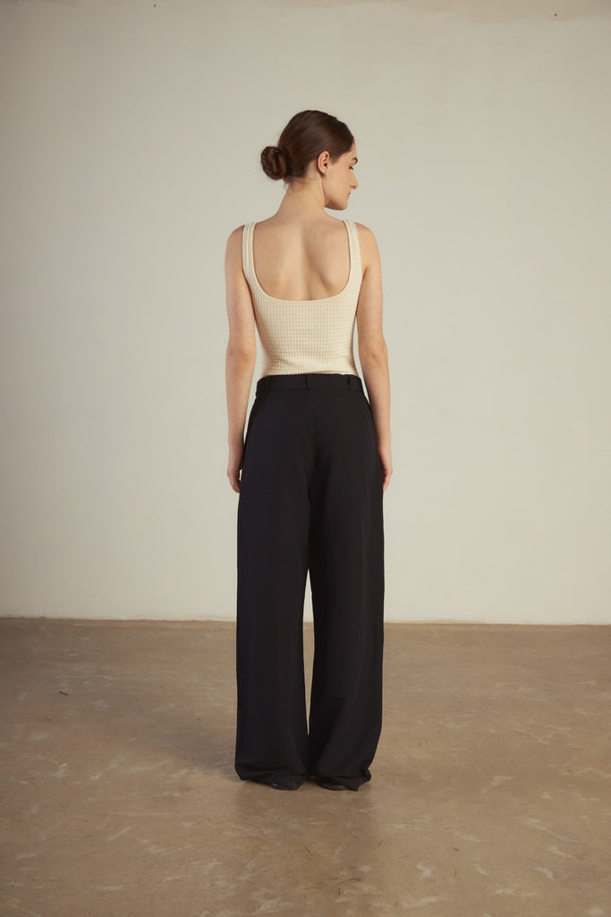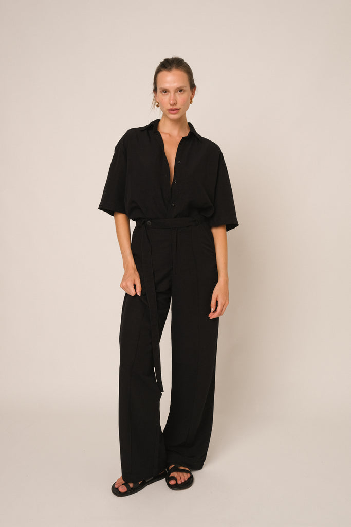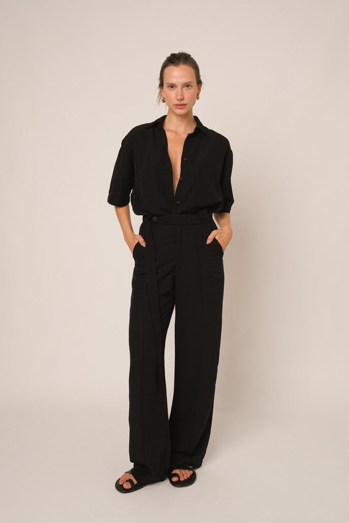 Calça de alfaiataria produzida em algodão brasileiro e cor preta. Possui detalhe frizado na parte da frente, e cinto removível para você usar como preferir.